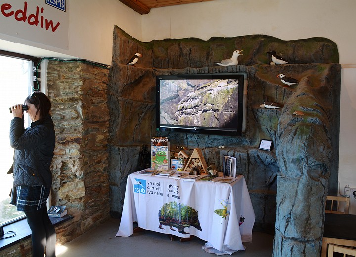 They also have quite a powerful telescope that you can use to view South Stack and on the cliffs, along with several pairs of binoculars for public use. Quite often Dolphins and Porpoises can be seen in the bay down below.